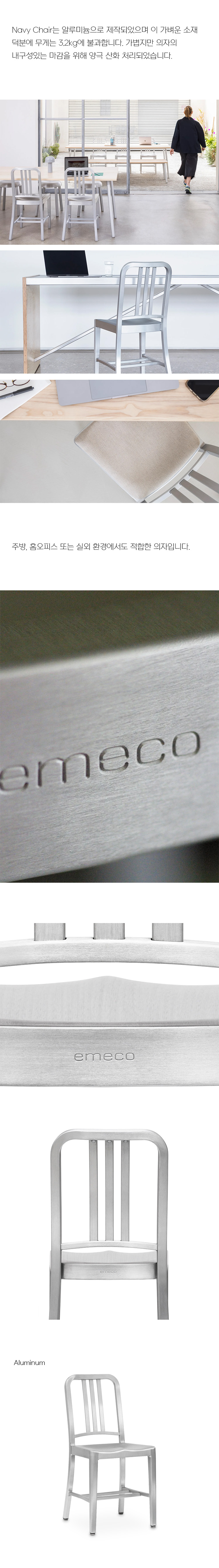 emeco는 재활용 소재를 가공해 가구로 만드는 업사이클링의 가치를 실현하는 가구 브랜드로, 환경을 생각하는 마음으로 지속 가능한 가구를 제작합니다. 좋은 의자를 만들기를 추구하고, 좋은 의자라는 건 결국 앉는 것을 뛰어넘는 수단이라 생각합니다. 그 철학으로 인하여 emeco는 1940년부터 알루미늄 소재의 의자를 생산해 오고 있으며, 제품 하나하나 장인들의 수작업으로 탄생해 평생 사용 가능할 정도로 견고하며 안락합니다.