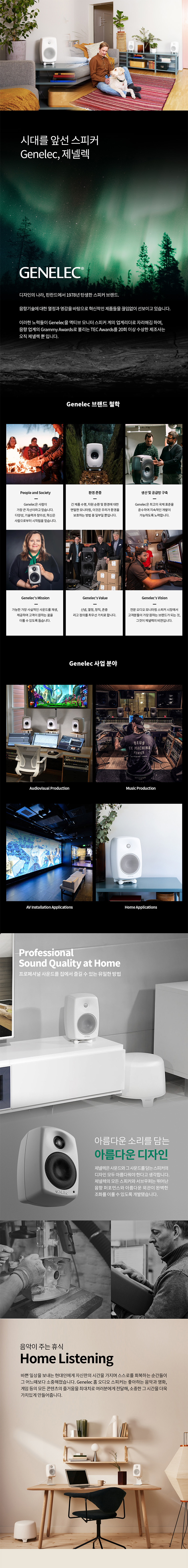 1978년 핀란드에서 탄생한 스피커 브랜드 제넬렉은 음향기술에 대한 열정과 영감을 바탕으로 혁신적인 제품들을 끊임없이 선보이고 있습니다. 이러한 노력들로 제넬렉은 액티브 모니터 스피커 계의 업계 리더로 자리매김할 수 있었으며 음향 업계의 Grammy Awards라 불리는 TEC Awards를 20회 이상 수상하였습니다.